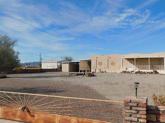 Beautiful Sante Fe Style doublewide manufactured home. This one a few sane Fe models in Quartzsite.Nice front porch for afternoon sunsets. enclosed awning back porch great for entertaining. 1 metal storage container and 2 metal storage sheds. security camera's, so much to mention lots of extra's. RV hookup and dump station.