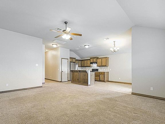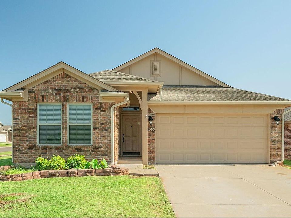 This open concept floor includes 1,473 sq. ft. of total living space. Home has 3 bedrooms & 2 full baths, there is also a two car garage. Living area has a vaulted ceiling and large windows. The kitchen has a large island topped with granite countertops and is open to the dining and family room, perfect for entertaining. Refrigerator included. The primary suite includes a ceiling fan with a beautiful sloped ceiling detail. The walk in closet is massive! Fully fenced back yard, and includes a storage shed. Mustang schools! Ideally located minutes from shopping, dining and highway access. Don't miss your chance to call this home!