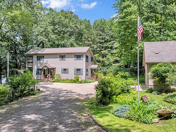 One owner Beauty! Lakefront 10-acre Retreat! Secluded Private Wonderful Up North setting with a resident Bald Eagle! Conveniently located here in Jackson County! Charming 4 Bed, 3 Bath home includes walkout lower level plus oversized garage with additional 400 finished square feet walkup room perfect as a craft room, workout room, dormitory or anything you can imagine. Tree lined drive leads to stunning waterfront nature sanctuary. Perfect for boating, swimming, kayaking, fishing, hunting & more! Separate den/bedroom on main level. Lovely deck lakeside & lakeside balcony off of owner's suite with hot tub. Dock included. Please note there are no realtor sale signs on the property. Fireplace perfect for fall, winter & cool summer evenings. Soaring ceilings, fireplace & skylights in the Great Room plus great views of the lake create a wonderful place for family & friends. Separate dining & large eat in kitchen connect to create an open floor plan that serves many different activities. New metal roof to be installed on both house and garage summer of 2024. Loft balcony offers another place for reading & relaxing. Upstairs you will find ensuite complete with private balcony lakeside complete with hot tub, laundry room & several walk-in closets. Walkout lower level includes family room, large office overlooking the lake plus another guest bedroom, full bath, workshop & good storage closets.