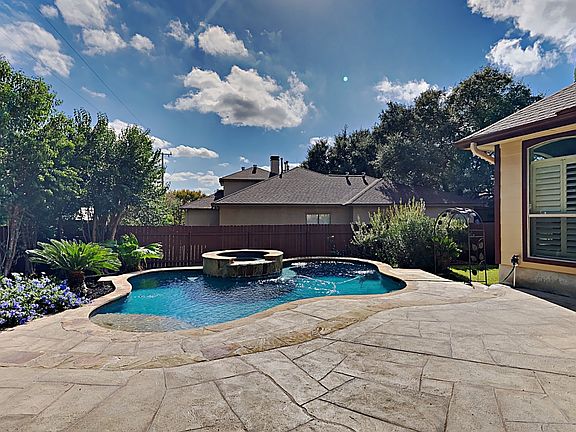 Here's your chance to own a 3/2/2 home in the prestigious Park at French Creek gated community. This home is absolutely gorgeous. Witness the beautiful approach as you drive up to this home situated on a large cul de sac lot. The front yard is beautifully landscaped featuring a plush and lush vibrant flower beds. You'll love the spacious floor plan offering a formal dining room, second eating area just off the kitchen, and a cozy living room featuring a fireplace. The island kitchen is a chefs dream offering granite countertops, gas countertop cooking built in microwave and oven upgraded plumbing fixtures and loads of cabinets. The nice size secondary bedrooms are located at the front of home while the primary bedroom suite is tucked away at the rear of home, featuring a gorgeous bath with two sink granite countertop vanities, garden tub, separate shower and huge walk-in closet. The rear yard is an oasis with a refreshing pool, hot tub, and spacious patio. Other features include upgraded lighting throughout, fresh paint throughout, wood flooring, tankless water heater, security system, water softener and so much more. Enjoy the community pool and park or venture out to the near by shopping and entertainment outlets. This home is conveniently located near I-10 and Loop 1604, UTSA, and minutes from downtown S.A.