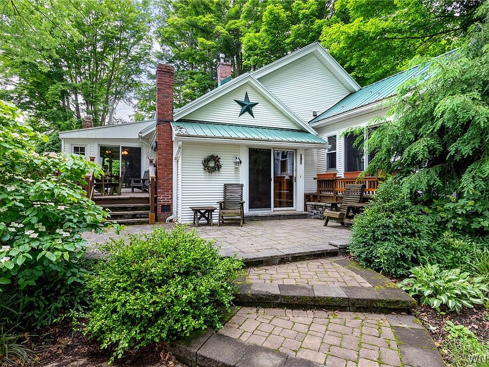 Rare opportunity to own your cozy dream home nestled on an idyllic setting of over 5 wooded acres. The charming home offers many updates including a newer kitchen, appliances (refrigerator, dishwasher), bathrooms, first floor laundry and fresh paint, black chain link fence with dog run. Among other things the home features a woodburning stove (NRTC) in the main section of the home and a gas fireplace in the primary suite, 6 panel wood doors, tankless hot h20, many built-ins including bookcases and window seats, wood beamed ceilings...too much to mention. Adjacent to the primary suite is a 4 season sunroom (150 sq ft in addition to tax records sq ftg) overlooking the fenced backyard and woods. Numerous patios and sliding glass doors help create additional "outdoor" rooms. 3 outbuildings including a 2.5 car garage, large shed and 2-stall barn offer utilitarian use while enhancing the charm and beauty of the property. Trails through the woods for hiking/snowshoeing, beautiful perennial flower beds, fire pit....this home has it all for the outdoor nature lover or cozy days inside. Offers, if any, are due Wed, 6/19/2024 at noon.