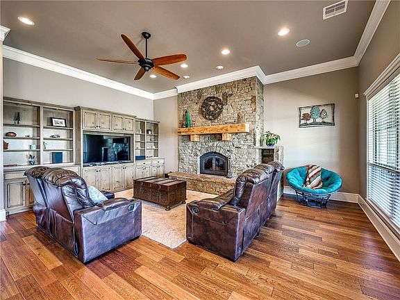 Spring fed pond in the back of your new home is next to your personal island! This amazing 2.5-acre treasure has something for everyone! A large front porch and 20-ft tall vaulted entry lead into your 'staycation' home. Out back is a large covered patio with commercial roll down shades and a flagstone open patio with a fire pit! Inside, the wood flooring throughout (only beds 2, 3, and 4 have carpet), Artisan FPX custom wood-burning fireplace, MIL suite, jacuzzi tub, makeup vanity, and walk-in shower in the master, 8-inch crown molding, 12-ft ceilings, fans in all the rooms, and 4 filter water purification system will catch your attention. Add to this--Kitchenaid appliances (including a warming drawer, double ovens, a drawer microwave, and a 6-burner gas range), granite throughout, a storm shelter, surround sound in the garage and on the patio, amazing storage, security system/lighting/smart door locks), and a 13-zone sprinkler and the list just keeps going! Access to everything!