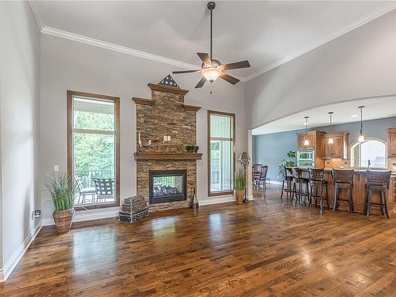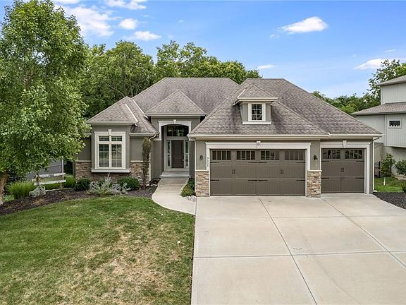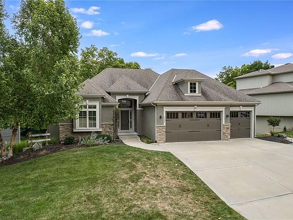 New Mark Homes built Ranch/ Reverse 1.5 Story offers an open & clean look. Stepping inside this impressive property you will notice wood flooring anchoring the main floor. The main floor spacious owner's suite has large windows to enjoy the treed backyard views. At the end of the workday escape in the master bathroom with tiled flooring bathroom and soak in the jetted tub. Get ready for the evening by using the large bachelor height double sink vanity. The Owner’s Suite has a large walk-in closet providing a lot of shoe and clothing storage. Sellers have paid attention to all the details-- lighting fixtures, door hardware and a large covered deck with a fire and ice fireplace. Admire the impressive kitchen with granite countertops and a large breakfast bar, custom cabinetry, and a walk-in pantry room with desk for an office. The floorplan is an open space allowing for easy transitions from the two main floor bedrooms to the living rm w/ stone gas fireplace and an eat-in dining/breakfast area, main floor laundry and access to the 3-car garage. On the main floor, the home plan has a full guest suite offering a window seat bench and full bathroom. Time to entertain... downstairs you will have sleeping rooms with 2 bedrooms and 1 bonus room that could be another sleeping area. Cozy up to the granite countered wet bar for refreshments and enjoy playing cards or watching the Chiefs in the large, finished terrace level recreational area. Check out the unfinished portion...perfect for lots of storage. The terrace level walks out to a covered patio and a large beautifully treed backyard perfect for hosting barbeques. Home is owned by non-smokers.