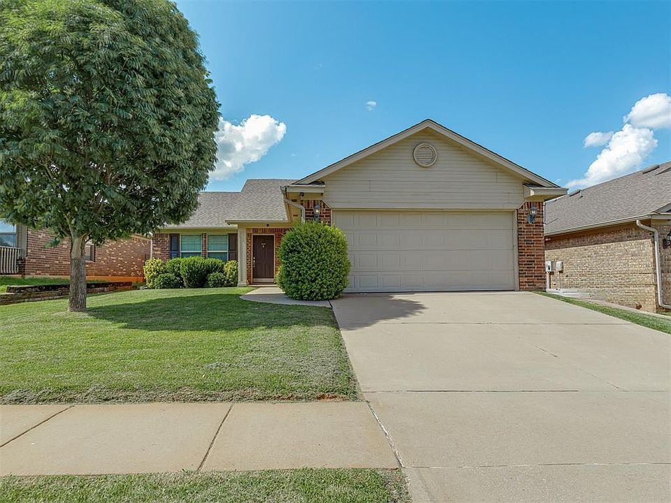 This charming 3-bedroom, 2-bathroom home offers excellent curb appeal and is nestled in the sought-after Fountaingrass neighborhood within the award-winning Mustang School District. Located just across the street from Mustang Valley Elementary, you’ll love the convenience of walking the kids to school! The kitchen features upgraded quartz countertops, a stylish subway tile backsplash, gas stove, and a large pantry. The eat-in dining area flows seamlessly into the huge living room with tall ceilings, creating an airy, open space ideal for everyday living and entertaining. The primary suite is generously sized, offering a large bathroom and a walk-in closet, while the secondary bedrooms also provide plenty of space and storage with their big closets. The home also features newer carpet, adding to the fresh, move-in ready feel. Step outside to the large, flat, fully fenced backyard featuring a big covered patio and a shed—perfect for storing tools, toys, or gardening equipment. This outdoor space is ready for summer BBQs, gatherings, or simply relaxing in your own private oasis. Enjoy a friendly community with amenities like a catch-and-release pond, scenic walking trail, and a park. Plus, you’re just minutes from highways, the turnpike, restaurants, shopping, and entertainment hotspots. This move-in ready gem is waiting for you—don’t miss out on making it your own!