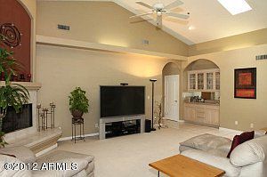CABO DEL RIO RETREAT SCOTTSDALE-Entertainer's Dream boasts resort-style backyard.Pool w/waterfall & full-length tiled covered patio.Breakfast bar,granite counter tops,large cooking island,and an abundance of cabinets and counter space(not to mention a built-in desk area to simplify your meal planning)in the gourmet kitchen opens up to the family room w/wet bar and FP will be awaiting those friend/family gatherings.