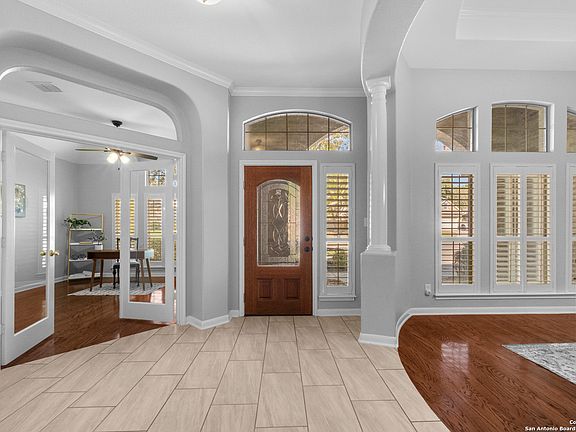 Nestled in a peaceful, gated cul-de-sac, this home stands out with incredible curb appeal surrounded by beautiful mature trees. Thoughtfully designed for convenience, it features a first-floor primary bedroom suite with a spa-like spacious bathroom. The open interior boasts two living areas, a formal dining room, cozy fireplace, and high ceilings. Step into the beautifully updated kitchen with sleek, all-white contemporary cabinetry, and a stunning tile backsplash. Experience the luxury of a private study, perfect for remote work or quiet reading. This home is designed with careful attention to wheelchair accessibility, featuring convenient ramps and extra-wide hallways, ensuring smooth and easy mobility throughout. Secondary bedrooms are also located downstairs, with an updated jack-n-jill bathroom that boasts new countertops and cabinetry, adding a fresh modern feel throughout. Escape to the versatile upstairs entertainment room or optional bedroom featuring a full bath and spacious closet perfect for a college student, mother-in-law suite, or kids' playroom. This property offers the lowest price per square foot listed in this community, providing instant equity for the buyer! You will also enjoy being minutes away from Old Town Helotes, La Cantera, and Six Flags Fiesta Texas. Don't miss out on this true gem and all the possibilities this home has to offer! This home qualifies for special zero down-payment 100% financing, with no PMI.