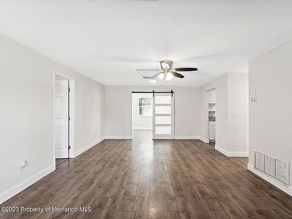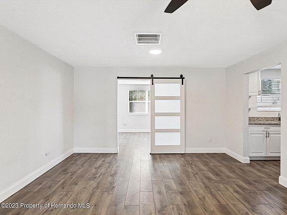 PRICE ADJUSTMENT!!! How lucky are you! This beautiful house, 2 bedroom, 2 bath is move in ready. Fully updated two years ago and it still looks brand new. The owners made a few more great updates that you will truly appreciate. Brand new fenced in yard, new washer and dryer, 2021, New refrigerator 2023, microwave 2022, new shed and new garage door opener. All you need to do is unpack your bags and barbecue and start making new memories. This amazing home may be considered a 2 bedroom, however, the 3rd room with barn doors could very well be one, 11 x 15.5. The double size lot gives you a spacious backyard plenty of room to entertain or let the dogs run free. Roof 2022. Only a short distance from US 19 and 14 minutes to the Suncoast Parkway. Don't let this opportunity pass you by, this home will not last long, call today to set up an appointment.