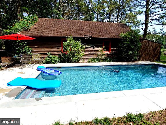 IMAGINE YEAR-ROUND or WEEKEND LIVING IN YOUR OWN PRIVATE LODGE! TWO completely different vacation environs! WOODLAND RETREAT with FISHING & CRABBING DOCK/INGROUND POOL and HAVEN JUST 20 MINUTES FROM OCEAN BEACHES! No other docks in sight, so bask in coveted privacy on 1.13 wooded acres with wildlife neighbors visiting from their undisturbed natural habitats. UNIQUE AIRBNB POSSIBILITIES! Romantically rustic Cabin-style home with 100’ water frontage on pristine Porters Creek. Organic log walls and vaulted/beamed wood ceilings. Air conditioned/heated main level with soaring Great Room made cozy by stone hearth wood stove. Quaint, sun-dappled open Kitchen with updated appliances, Dining Area, and separate Laundry. Characterful main level Bedroom with 2 double closets and Full Bath. 2 Charming upper Bedrooms with ceiling fan breezes; Full Bath. 2 Screened porch areas gazing over lush native foliage bursting with seasonal colors and serene pond. Creekside concrete inground pool (14’ x 32’) w/automatic vacuum! 2-Car detached garage/storage and furnace shed. Baseboard electric heating on both levels; propane furnace shed for main level; upper level window unit that is both A/C. and heating unit. BASK IN UNFORGETTABLE CREEK or OCEAN SUNSETS. ALL OFFERS WILL BE REVIEWED ON SUNDAY, JULY 16th.