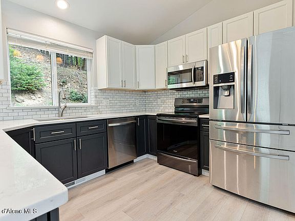 In the heart of the winding roads, forested lots, beautiful homes and incredible lake views that make up Armstrong Park, sits a remodeled 4 bed, 3 bath home with curb appeal that charms. With nearly 1,900 sq. ft., of open concept living space, the floor plan is suited to entertain. Vaulted ceilings, 2 living spaces, new bright kitchen with stainless steel appliances, deck off the dining space, fenced in backyard, and exclusive access to the community clubhouse, swimming pool & tennis courts, park and off property RV parking make this a house you need to come see. The Centennial Trail lies at the bottom of the hill, providing access to the network of biking and hiking trails that crisscross the area. You're minutes from downtown CDA and best of all, it's walking distance to Stella's on The Hill with the most incredible views of both Lake Coeur d' Alene and Fernan Lake!