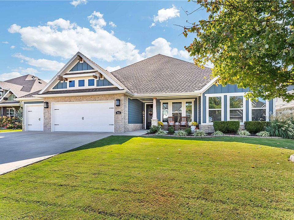 Why wait for new construction? Move in now with the landscaping, covered patio outdoor space, fence, irrigation & shed already in place! This house is immaculate inside and out! The split floor plan w/ open concept living space & beautiful wood floors flows perfectly for everyday living & entertaining. Relax on the North facing porch or on the covered patio complete w/ plumbed gas grill & fireplace. Formal dining room connects to the kitchen thru the butler’s pantry & can be used as an office or family room. Kitchen features granite, convection oven, gas cooktop, stainless appliances & a large pantry! Primary ensuite is at the back of the house w/ walk-in closet, granite, dual vanities, soaker tub & tile shower. Large 3-car garage leads into the oversized mud room/laundry room & then conveniently into the kitchen. This house has a great location, close to schools and only 4 miles to the I-49 bypass / Hwy 72 exit & 6 miles to Downtown Bentonville. Subdivision POA includes community pool and clubhouse.