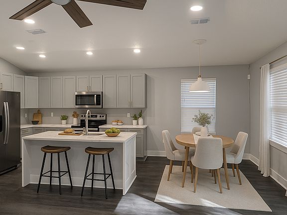 Beautiful New Construction Ready Now! Step into this stunning home featuring a welcoming foyer and an open-concept design. Enjoy a well-appointed kitchen with abundant cabinet space, stainless steel appliances, elegant waterfall countertops, and a stylish subway tile backsplash. The spacious owner's suite offers a large walk-in closet, double vanities, and a luxurious walk-in shower. Additional highlights include beautiful LVP flooring throughout, recessed lighting, decorative ceiling fans, and blinds on all windows. A convenient laundry room is located inside the unit. Complete with a 2-car garage, this home perfectly combines modern finishes with everyday comfort.