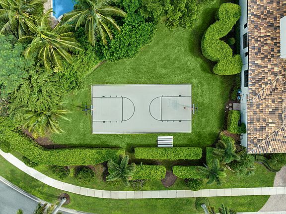 Welcome to 9510 Grand Estates Way - a sprawling estate situated on one of the largest lots within the highly sought-after enclave of The Oaks in Boca Raton. This remarkable home beckons with it's 8,106 total square feet and rests on a half-acre with a private full-sized basketball court, pool with built-in spa, four-car garage, additional yard space for weekend activities, a covered patio to escape the sun, and so much more. With six ensuite bedrooms, two half baths, an inviting office, and a perfectly-situated loft, this floor plan seamlessly combines exquisite finishes and top-notch craftsmanship throughout it's expansive, sun-drenched interiors. Tucked away in a serene cul-de-sac, this home makes a commanding first impression, where an entryway unfolds into a magnificent foyer graced by soaring 30-foot-high ceilings in the two-story grand entranceway. The living room boasts an alluring fireplace and has large captivating windows on the rear side of the home which overlook the serene lake and pool deck. A culinary masterpiece in its own right, the chef's kitchen showcases custom cabinetry, Sub-Zero and Wolf appliances, quartz waterfall countertops, a generous island with a secondary sink, and a convenient walk-in pantry. The kitchen transitions seamlessly to a spacious and tranquil family room and an oversized breakfast nook adorned with shiplap ceiling details.
