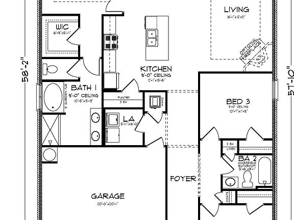 Entering the home is a hallway leading to two bedrooms separated by a full bathroom with linen closet and shower/tub combination. The opposing wall has the laundry room and the garage access.