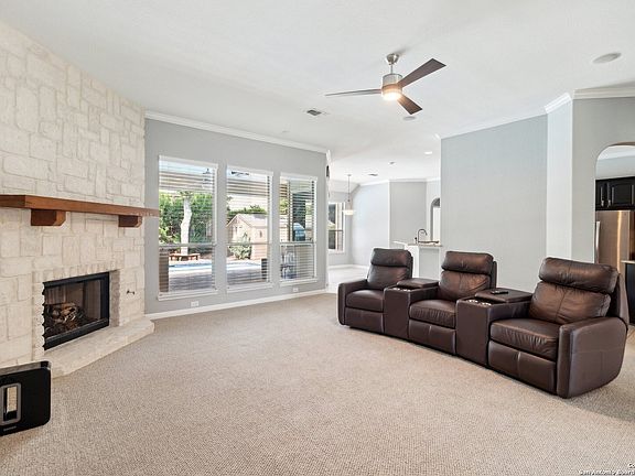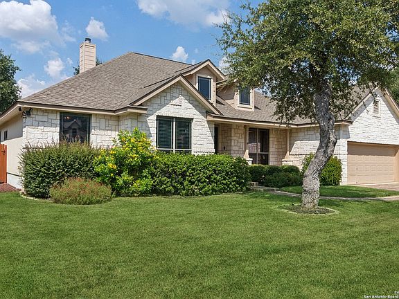This stunning 4-bedroom, 2.5-bathroom home with a dedicated office offers a spacious open floor plan with stylish updates throughout. Large windows fill the home with natural light, showcasing the beautifully designed oversized great room-perfect for relaxing and gathering with loved ones. A gorgeous stone fireplace adds warmth and character, while the updated kitchen boasts a modern island, breakfast bar, and eat-in dining area. The formal dining room provides flexibility and can be used as a bonus room to suit your needs. Nestled in the charming small town of Helotes, this home provides the tranquility of suburban living while being just minutes from San Antonio's conveniences, including HEB, Home Depot, La Cantera Mall, top-rated medical facilities, parks, and entertainment. The backyard is a true zero-scape oasis, designed for both relaxation and entertainment. A sparkling pool, a covered patio, and a spacious deck create multiple areas for outdoor enjoyment. The outdoor kitchen is perfect for grilling, entertaining guests, and enjoying game days or a round of cornhole. This inviting space is an ideal gathering place for children, grandchildren, and friends to make lasting memories. An oversized shed, designed as a third garage, provides exceptional storage or a flexible workspace. Inside, the beautifully updated kitchen and bathrooms add a modern touch, while the primary suite boasts crown molding and a generous walk-in closet. The garage features an epoxy floor and numerous extra shelves for optimal organization, while the attic provides abundant storage space. The charming front porch is the perfect spot to unwind in rocking chairs and enjoy the peaceful surroundings. Located on a private, quiet street with wonderful neighbors, this home is situated in a gated community with highly rated schools. It offers a perfect blend of comfort, style, and convenience-ideal for those seeking a serene retreat with easy access to big-city amenities.