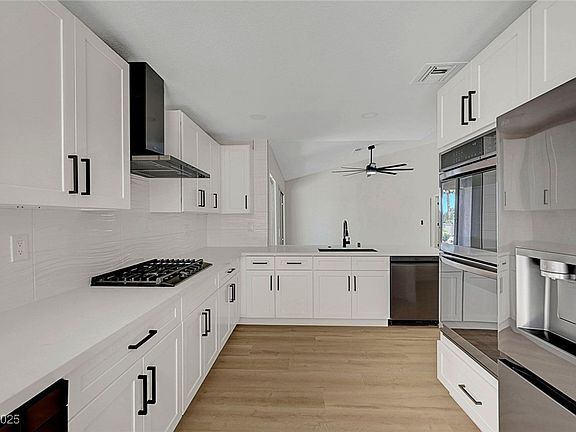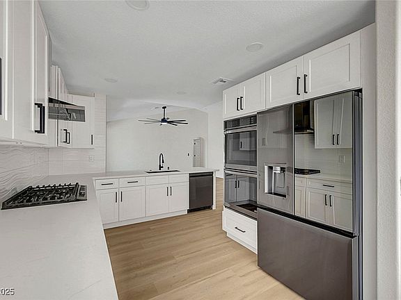 Fantastic completely remodeled open concept home in the age restricted 55+ Sun City Summerlin community! This home features new quartz countertops throughout, kitchen sink and the stove location were switched unlike other remodels creating a more functional kitchen, new custom cabinets throughout, new LG black stainless steel appliances, double ovens, microwave, refrigerator, kitchen backsplash, dual bathroom vanities, custom tile shower, new exterior/interior paint, laminate flooring with 5 inch baseboards, soft water system, new plumbing and lighting fixtures, and vaulted ceilings! Sun City Summerlin has again won best Premier 55+ community in the state of Nevada and #3 in the US with 3 golf courses, 2 restaurants, 4 club houses, many amenities including 4 indoor/outdoor pools, gyms, tennis and pickle ball courts, racquetball court, baseball park, miniature golf, roaming patrols, social clubs and activities galore! Living in Sun City Summerlin makes you feel like you are on vacation!