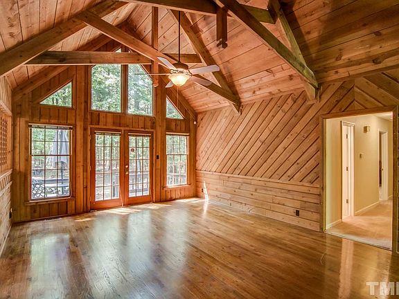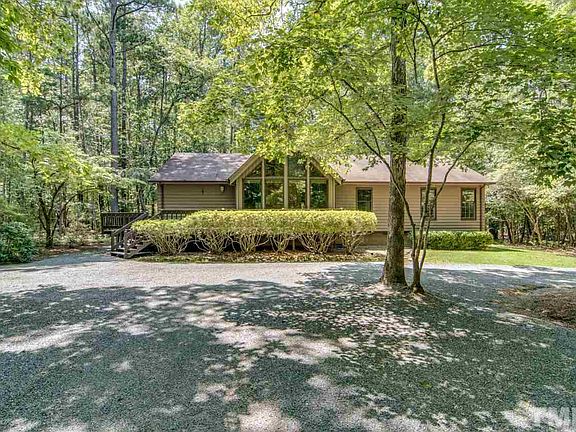 PURE SERENITY! Beautiful one level home set on a private 1.3 acre lot. Tons of windows offer great natural light. The inviting living room offers hardwoods, stained wood walls & ceiling and features a wood burning stove. Spacious kitchen with lots of cabinets and counter space. All appliances convey. Pull down attic & storage room. Lots of decking. Access to the community walking trails right off the backyard. Great community with large lots but still a neighborhood feel...Convenient to Carrboro & UNC!