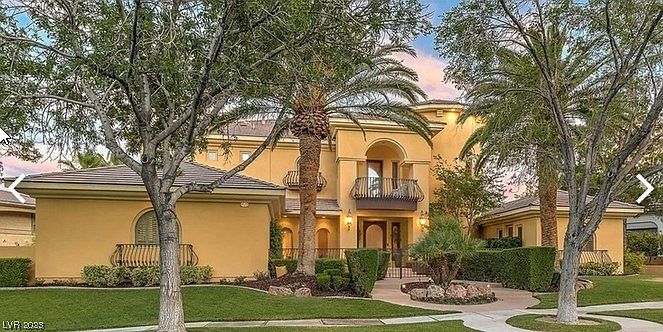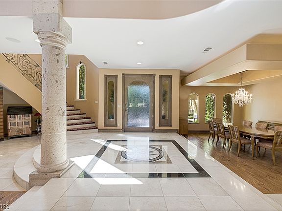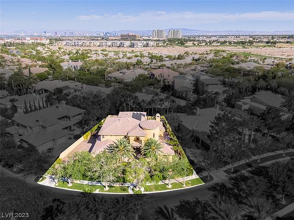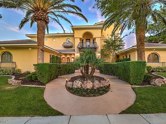 Beautiful custom luxury home in Canyon Fairways at Summerlin! Enter through a private courtyard with mature, lush landscaping. Designed by JVC Architects, this home is intricately designed at every turn! The main living area features a formal dining room, separate living room with a fireplace, and a spacious family room with a wet bar and large glass windows overlooking the backyard. Gourmet kitchen with stainless steel appliances, dual sinks, and tons of cabinet and counter space. Five ensuite bedrooms throughout both levels of this home. Large primary suite with a double sided fireplace, private balcony, built-in cabinets, and a wet bar. The spa-like primary bathroom feature a walk-in shower, jetted tub, dual vanities, and custom walk-in closet. Journey to the backyard where you will find a large covered patio, grass area, a built-in BBQ, and a sparkling pool and spa. A true gem! Tour this Summerlin luxury home today!