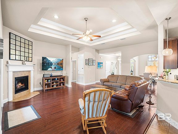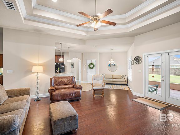 WELCOME TO THIS IMMACULATE GOLD FORTIFIED HOME 4 bedroom 2 bath HOME IN OLDFIELD in Daphne, AL. As you walk in you are greeted by spectacular hardwood flooring and and open concept home with a beautiful triple trey ceiling in the family room. On your right hand side there is a the 4th room, which could be used as an office or 4th bedroom, with a bay window. The primary bedroom has a sitting area which opens to the back porch. It features a spacious formal dining room with graceful arches. Enjoy the gourmet kitchen with 5 burner gas stove, granite countertops, and a beautiful tumbled stone backsplash. Enjoy morning coffee in the screened porch that opens directly from the primary bedroom and the family room onto the large backyard. GREAT FLOOR PLAN if you covet a bit of privacy this split concept is definitely for you! This home is part of the Phase 1 neighborhood, which includes the Pool for your enjoyment. All information and measurements to be confirmed by buyer and/or buyer's agent. Buyer to verify all information during due diligence.