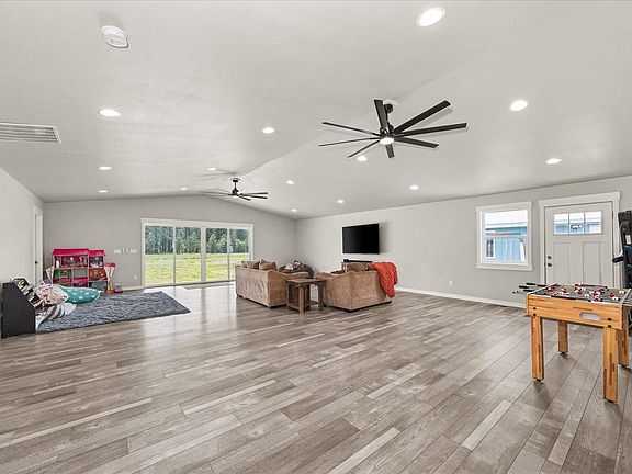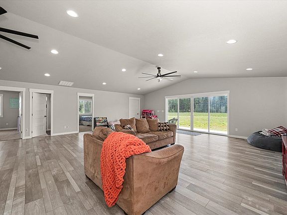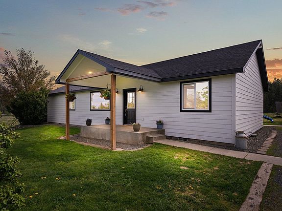 Welcome home! New roof, siding, windows and heat pump in 2021. Absolutely everything has been redone from floors to kitchen, bathrooms, and baseboards. The custom farmhouse finishes with vaulted ceilings, stainless steel appliances and 1000 sq. ft. living room make this home a true entertainers dream. The 12' double sliding glass doors open up to a picturesque back drop and 15X40 covered concrete patio. Patio is wired for a hot tub! Across the circle drive is an RV pad, with its own 200 amp service that is separately metered. The garage is currently used as a gym space and is insulated and heated! Beyond the front yard you'll find several fruit trees. You have to see it to take it all in. Located just minutes to Spokane, Cheney, and the airport.