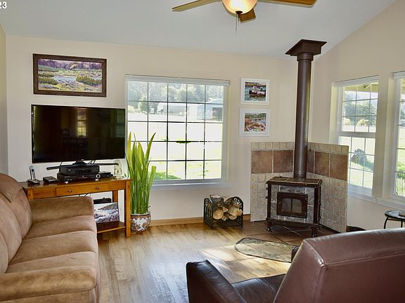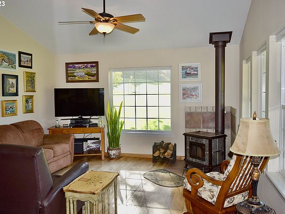 A charming riverfront residence nestled on 18 acres along the scenic Pistol River. This inviting home is filled with natural light and features three bedrooms and two full baths, adorned with beautiful myrtlewood floors on the main level, complemented by granite counters and tile floors in the kitchen. The sunny locale boasts fruit trees and a fenced garden area, creating a delightful outdoor space. A detached 36 x 36 pole barn includes two removable horse stalls, the level area has electric fencing for added convenience. The property is accessed through a solar-powered gate, ensuring security and eco-friendliness. The home has a covered front porch, rear deck, and rear patio featuring a hot tub.