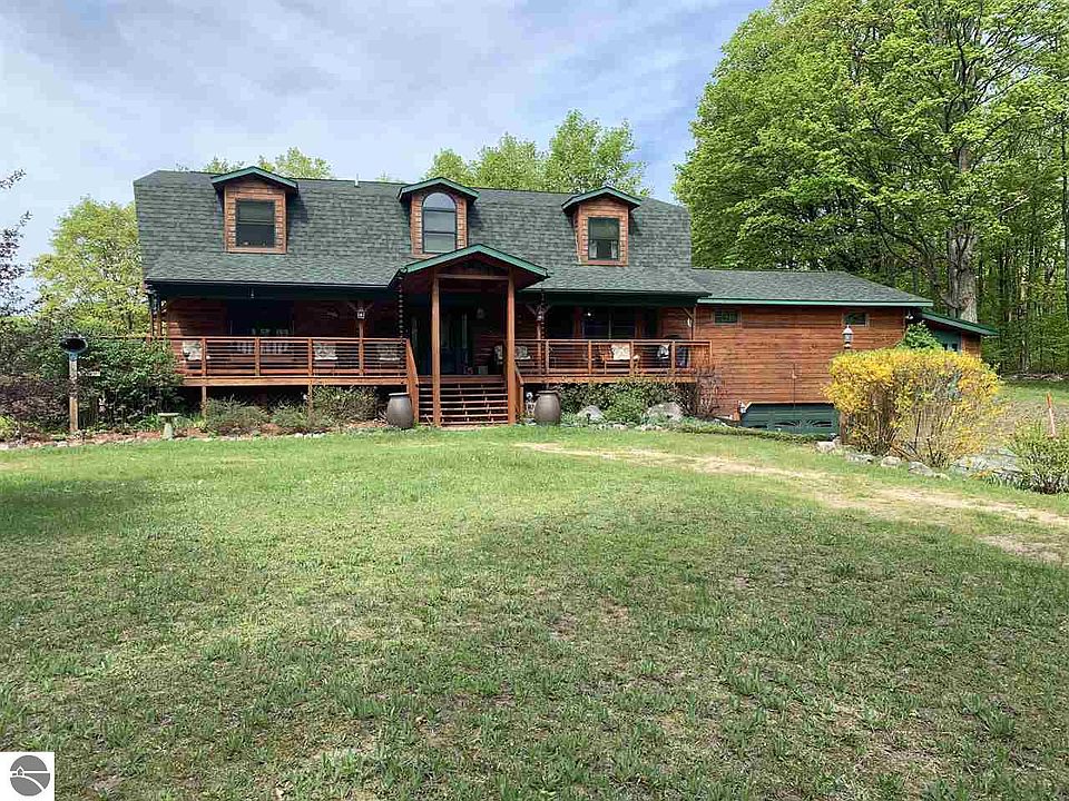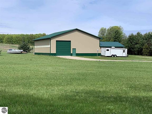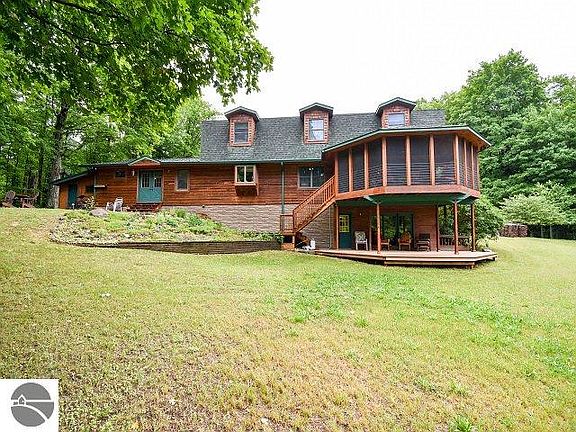 Let your Up North dreams come true on this truly amazing property! This remarkable home sits on 22 private acres near quaint Alden. New gambrel roof, bamboo flooring, front windows, and all outside wood has been freshly stained. A well-executed remodel includes updates throughout this 5 bed/4 bath countryside homestead with 4700+ sft of living space. An expansive covered wrap-around porch beckons you to sit and relax. Main floor living area with gas fireplace, a nearby cozy den perfect for reading, an open country kitchen with stainless steel appliances, a bright dining room complete with breakfast bar, screened-in gazebo overlooking the woods are all well appointed spaces in this house. A separate main floor guest suite with livingroom and bedroom along with it's own private entrance. The second floor master suite has a soaking jetted tub, sitting area and private balcony. Three additional bedrooms, all tastefully decorated. Large upstairs bathroom has a jetted tub & shower for guests. A finished walkout lower level includes a family room with wet bar, sitting area and access to the new back deck. A second full bath offers a walk-in tile shower and a sauna room. The exercise room has interlocking tile floors and plentiful lighting. Home has storage abound, thoughtful details in the overall layout, and an attached two-car garage. Well maintained gardens surrounded by a canopy of mature trees. There is a detached pole barn with two additional workshops including cement floors, electric, and pull-through rolled doors. Additional horse shed with water and electric.