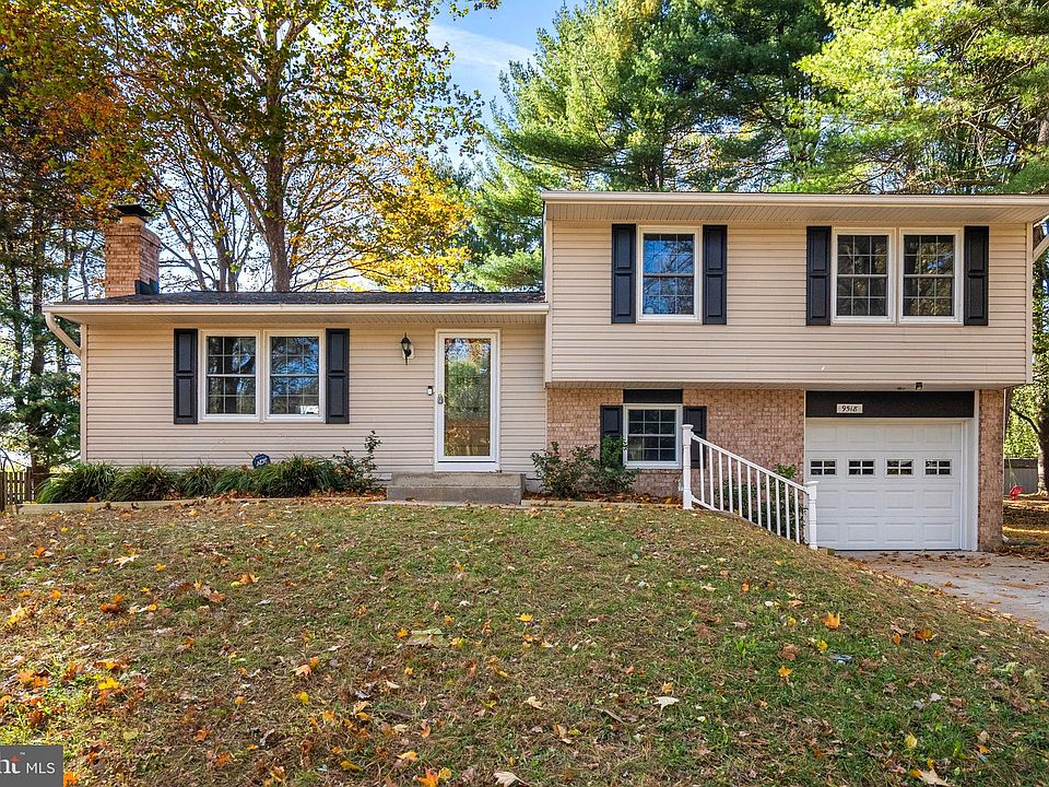 Charming split-level residence offering 4 bedrooms, 3 bathrooms, 2,385 finished square feet, and a 1-car garage in desirable Stevens Forest. Step into the welcoming foyer, completely open to a spacious living room highlighted by a brick-accented fireplace and vaulted ceilings with exposed beams, creating warmth and character from the moment you enter. Gleaming hardwood floors flow into the sunlit dining room, where sliding doors lead to the expansive deck, perfect for entertaining or enjoying a quiet morning coffee surrounded by nature. The eat-in kitchen combines charm and functionality, featuring stainless steel appliances, a pantry, ample cabinetry, and a cozy breakfast area for casual dining. The upper level offers four comfortable carpeted bedrooms, including a bright and spacious owner’s suite with a walk-in closet and a private en suite bathroom complete with a corner soaking tub and separate shower. The lower level expands the living space with a family room featuring built-in bookcases and gleaming floors and a large open recreation room with walk-out access to the backyard. The lowest level provides a laundry and storage area, and a versatile bonus room with a closet—ideal for an office or guest room. Outdoor living is a delight, with a large deck overlooking a spacious backyard that backs to trees with sports courts and playgrounds just beyond.