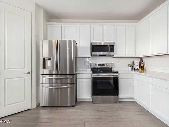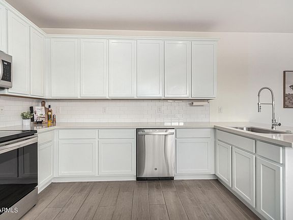 Welcome to this amazing coastal contemporary home that features 3 bedrooms, 2.5 bathrooms plus a loft. This home is on a one of a kind premium corner lot. Walk into upgraded staggered plank tile floors downstairs & lots of open space. Kitchen features white upgraded cabinets, Quartz counter-tops, subway tile backsplash, pantry, stainless steel appliances with fridge included. Great breakfast bar area that overlooks your spacious great room. Your oversized primary bedroom & bath has new custom barn door, dual sinks, walk in shower with glass enclosure & large walk in closet. Open your motorized custom roller shade to your completely landscaped low maintenance yard with pavers & artificial turf. Great for a backyard BBQ & to watch the AZ sunset. Enjoy many added upgrades throughout including custom shutters, ceiling fans in all the rooms, wall shelfs, epoxy floors in the garage, built in garage cabinets, hanging storage racks & so much more. Cadence at Gateway has a beautiful entrance upon entry. 3 resort-inspired pools including a lap pool, 2 waterslides, spa, lots of day beds, covered cabanas, barbecue grilling station & firepit. Resident clubhouse has a well equipped exercise room with free weights, treadmills, elliptical trainers, fitness on demand with some great yoga, zumba, stretching & floor exercises. Gaming lounge with pool tables, cafe with drinks & snacks & onsite dog park & dog run area. Lots of parks, walking trails, basketball, volleyball, tennis & bocce ball. Close to freeways, shopping & restaurants. Come take a look today!