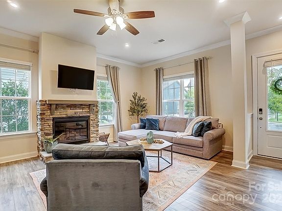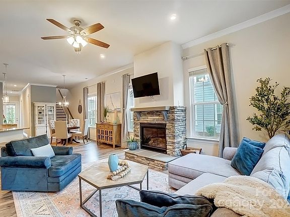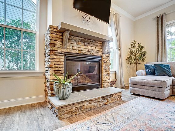 Prepare to fall in love with this townhome located in the picturesque Charleston style community of McCullough. This meticulously cared for, end-unit features an open concept floor plan with lots of natural light. Primary suite is on the main level! This home boasts a large, open kitchen with gas range, granite countertops, tile backsplash, tons of storage & counter space. The living room has a gorgeous stacked stone surround fireplace. Primary suite features double vanity sinks, oversized walk-in tile surround shower, private water closet plus large walk in closet. Upstairs you’ll find three generously sized secondary bedrooms plus a large loft. Walk in attic for tons of storage. 2 car attached garage. Custom paver patio for outdoor entertaining. McCullough’s amenities include a pool, kid swim area, playground, tennis & pickle ball courts & fitness center, plus walking trails. Located just a short drive from downtown Pineville that is full of shops, restaurants, local parks & more.