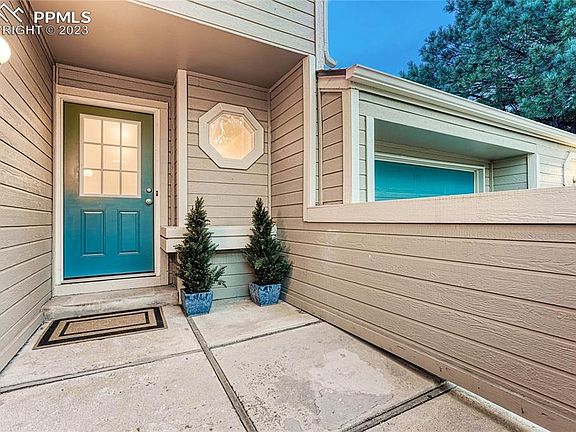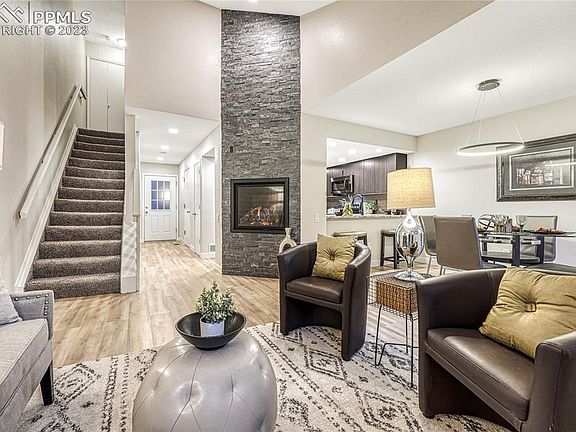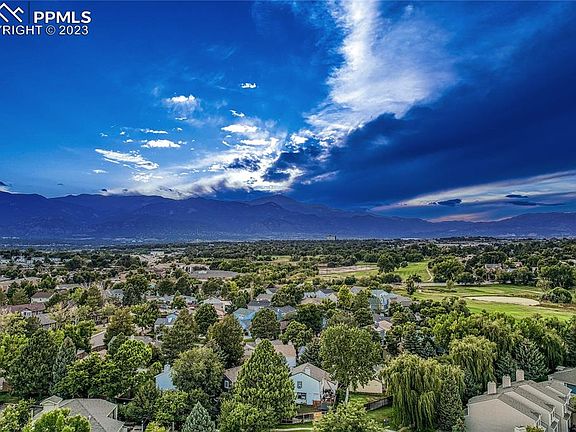 Can you imagine living in a cozy little neighborhood nestled between Valley Hi Golf Course (with its vintage-vibe Pub & Grill) & Roy Benavidez Park just steps away? It will be hard to decide where to enjoy your morning coffee or evening glass of vino in your new nest- Inside or Outside? The walkout patio is perched alongside a mini open space with gently rolling grass/river rock landscaping with lush trees strewn throughout. Inside the ambiance is framed by the towering stacked stone gas fireplace, windows that look out to the rolling landscape, and a stunning kitchen with bar-height seating, black stainless-steel appliances, slab granite counters, and “Parade Home” worthy cabinetry! Enjoy vast views of the Rocky Mountain range and Pikes Peak as you stroll the walking paths along the golf course or take time in the park, just steps away from your front door. The Laundry, with a full-size washer and dryer, is conveniently located on the bedroom level so no running up and down the stairs. There is a clubhouse for hosting any large get-togethers you may want to have and additional parking for guests throughout the circular driveway. It is perfectly positioned to be able to get to the Colorado Springs Airport within 13 mins., Ft Carson in 15 mins., Peterson AFB in 10 mins., and I/25 to head north in 6 mins. An extensive & impressive list of the recent updates and their costs will be available to you when you “Come take a look inside!”