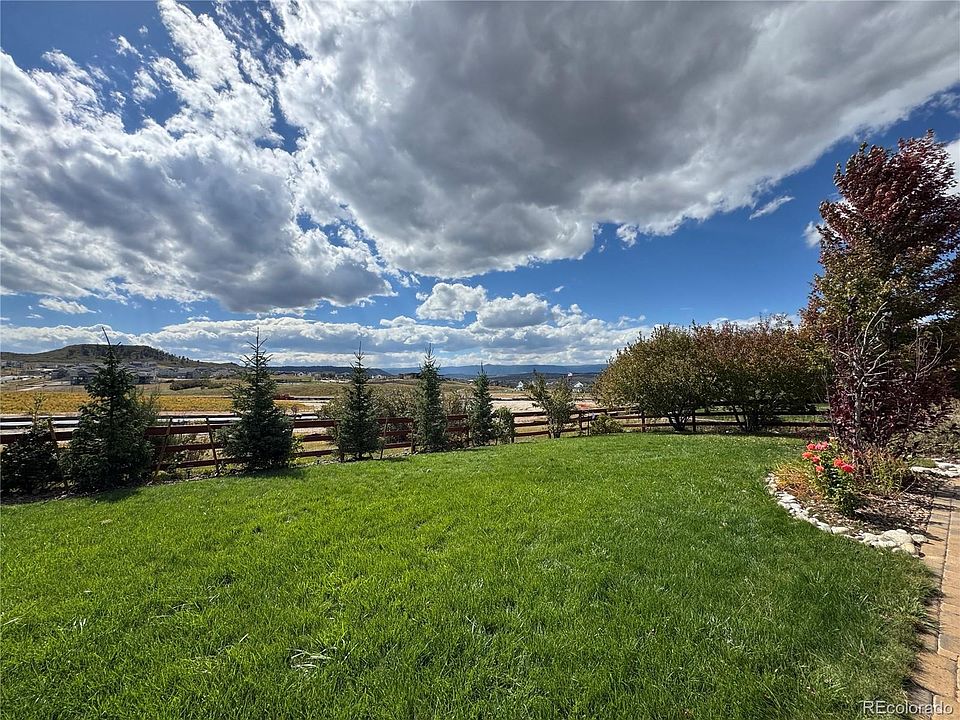 Set against a backdrop of bluff and mountain views, this Castle Rock two-story offers a welcoming blend of space, style, and updates. Outdoors, the newly designed backyard landscaping features beautiful blue spruce trees, while the greenbelt setting enhances privacy and frames the scenery. Inside, a graceful curved staircase makes a memorable first impression and leads into the heart of the hom, the gourmet kitchen with expansive granite countertops, extended serving area, pantry, and newer appliances. Multiple living and dining areas, both formal and casual, provide flexibility for gatherings, entertaining, or relaxed evenings at home. A main-floor bedroom adds versatility for guests, a home office, or multi-generational living. Upstairs, three additional bedrooms are joined by a flexible loft that can serve as a playroom, media space, or second office. Plus a very large unfinished basement for future expansion. Recent improvements add even more peace of mind, including owned solar panels, a new roof, a new sliding back door, and a 3-car garage with insulated doors and openers. Blending elegance with everyday functionality, this move-in-ready home is designed to be enjoyed inside and out.