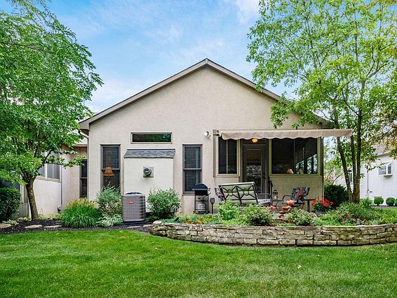 Fantastic Linworth Village attached patio home on a private lot backing to trees! Same owner for 22 years, meticulous condition! Beautiful kitchen with granite counters, eating bar, white cabinets, front breakfast nook, hdwd floors. Lg dining area opens to a Great Room with marble FPLC. Light & bright with tall windows. Glass doors to a vaulted heated & cooled Sunroom w/wood laminate floor, custom shades w/door to private patio with covered awning & edged stone flower beds. LG Primary Bdrm open to Sunroom. Both 1st floor baths remodeled in 2022 with LVP floors & Quartz Counters, new fixtures. Finished Lower Lev Rec Room and 3rd full bath. Huge storage. New Bryant HVAC in 2023, New Roof 2020,. SQ FT 1,860 first floor + 497 fin in LL. Iron railings, Surround Sound. Carpet like new. A GEM!