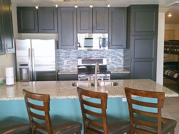 Front row & top floor! 2 BR/2 BA, Gorgeous condo overlooking the Gulf of Mexico. The balcony is currently inaccessible but provides a great ocean view even from inside the unit. Tile floors throughout. Great layout. Condo comes fully furnished. Kitchen with granite counters, tile backsplash and stainless appliances. Both bedrooms are large enough and furnished with king size beds. Bunk beds are located in the hallway. Both full baths provide custom walk-in showers and granite vanities. A spacious living area with sectional sofa offers access to the front row balcony. Condo also has in-unit washer and dryer for your convenience. Property amenities include 3 pools (one is heated), a fitness center, outdoor spa and poolside cabanas, volleyball area, ping pong and other activities. Basic cable, internet, water and trash included in maintenance fee.