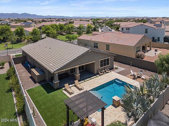 Stunning single-level home in the highly-desirable gated master-planned community of Eastmark. This 3-bed, 2.5-bath beauty includes large office/den & smaller bonus area. Popular great room layout! Gourmet kitchen features double pantries, high-end appliances including refrigerator & gas cooktop, tons of white cabinets, & large center island. The primary suite is split from the rest & boasts an ensuite w/ modern barn door & headboard. Amazing backyard for entertaining! Larger lot includes resort-style pool w/water feature, heated spa, synthetic grass, pergola, oversized covered patio & plenty of space for firepit & extra seating. Surround sound inside/out complete this perfect home! Solar panels, tankless H2O heater, ceiling fans, plantation shutters & sunscreens equal low energy costs!! For the right offer, seller will pay off solar loan in full!!