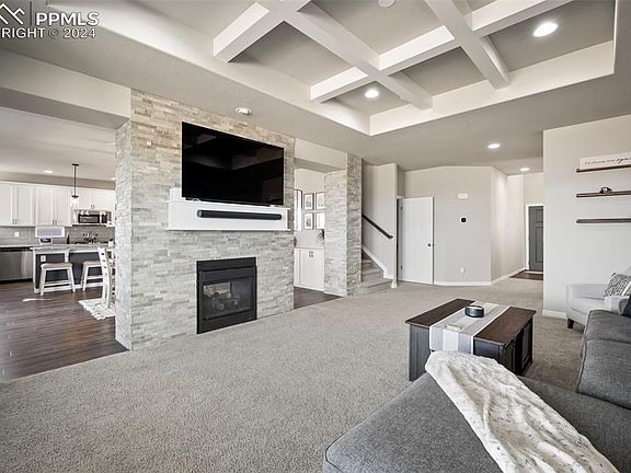 Welcome to this beautiful home in Meridian Ranch! Step into luxury with 4 bedrooms, 4 bathrooms and a bright, spacious layout! The gourmet kitchen features extra cabinets, stainless steel appliances with a gas range and double ovens, and a walk-in pantry. The living room boasts a striking coffered ceiling, a stacked stone two-way fireplace that opens to the dining area, and a large picture window that floods the space with natural light. A generous mudroom with a built-in bench seat leads to the three-car garage, which features tall ceilings for extra storage and finished epoxy floors. Upstairs, you'll find an incredible primary suite complete with a double-sided fireplace, a large sitting room, and a primary bath featuring a spacious shower with double shower heads, double sinks, a water closet, and a massive walk-in closet with a window. There are also two generously sized bedrooms, each with walk-in closets, and a secondary full bath with a double vanity. The second floor also includes a laundry room and a spacious loft space. The walk-out basement, with its 9-foot ceilings and ample windows, opens to an extended covered patio and a larger-than-average yard! It features another large bedroom with a walk-in closet, a full bath, and a spacious finished storage room. Enjoy the low-maintenance yard with new turf. This home is beautifully designed with great colors throughout. Make it yours today!