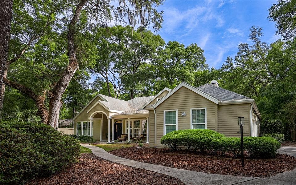 Luxurious Haven in Haile Plantation Nestled within the desirable Haile Plantation community, this executive pool home epitomizes luxury living at its finest. Freshly introduced to the market, this exquisite property boasts a prime location and exceptional amenities, making it a haven for those who appreciate tranquility and sophistication. Situated on a serene .63-acre cul-de-sac lot, the property is enveloped by majestic moss-draped oaks and backs up to a wooded area that will never be developed, ensuring privacy and natural beauty for years to come. Multiple ground-level and raised garden beds await your green thumb, providing ample space for cultivating your favorite plants and flowers. A dedicated outdoor patio area with a planting station caters to gardening enthusiasts, offering a tranquil space to indulge in your botanical passions. Step inside this 4-bedroom, 2-bathroom home and immerse yourself in an atmosphere of elegance and comfort. The bright and airy ambiance is accentuated by a contemporary palette, high ceilings, and hard surface flooring throughout. The kitchen seamlessly integrates with the vaulted ceiling family room, featuring a cozy fireplace, ideal for relaxation or gatherings with loved ones. Spanning 2,334 square feet of naturally lit living space, this home offers generously sized rooms with versatile utility. The primary suite serves as a true retreat, boasting two walk-in closets, double vanities, and a spacious shower. French doors adorn the primary bedroom, living room, kitchen, and family room, leading out to the expansive lanai. Step outside to the enormous screened pool, complete with a built-in hot tub, offering an idyllic setting for both quiet retreats and lively entertainment. Additionally, a smaller sectioned fenced area provides a safe and secure space for fur-babies to frolic and play freely. With its serene surroundings and thoughtful amenities, this residence provides an inviting retreat for those seeking a peaceful haven or a vibrant outdoor oasis for relaxation and enjoyment. Don't miss your chance to experience the luxury lifestyle of Haile Plantation. Schedule your private tour today!