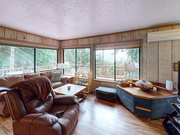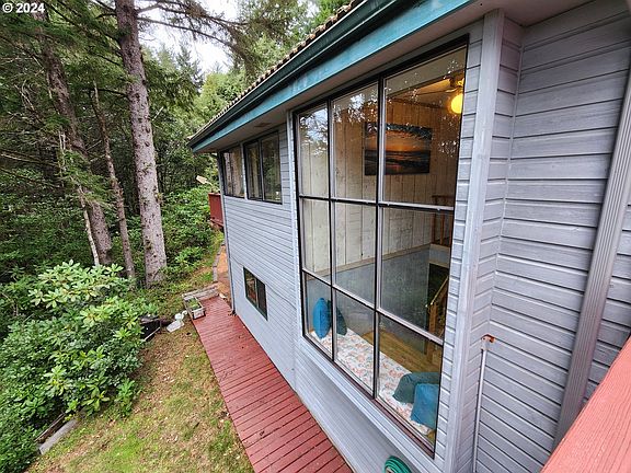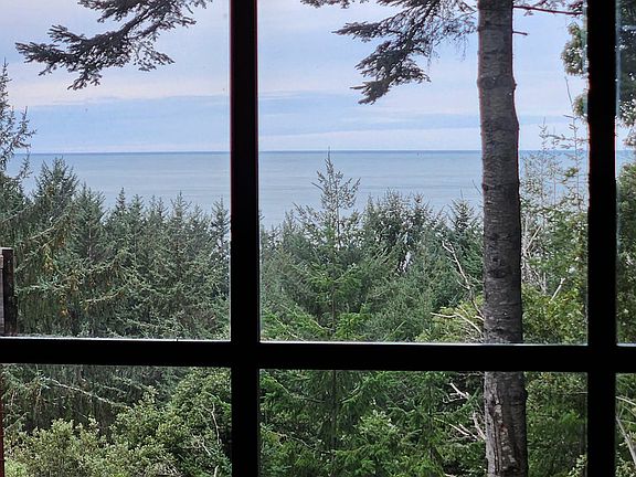 Located in a well-designed neighborhood and tucked privately into a clearing in the forest is this 2BR/2BA OCEANVIEW house that feels like you are in a luxury treehouse! From the open concept living/dining/kitchen area you can trek onto the spacious ocean view, wrap around deck (complete with retractable awning to stay out of the sun). Enjoy the water and forested views from expansive windows in the living/dining/kitchen. Two bedrooms with a bath and laundry on the upper level and 2 bonus rooms and a bath on the main level make it a very adaptable home for a buyer's needs. Property has an area for the pets, a hot tub for the peeps and is just a short jaunt to the beach. Single car garage for a car/workshop or storage area. Natural surroundings make it a fairly low maintenance yard. Take a peek and enjoy the peacefulness of the Horizon House.