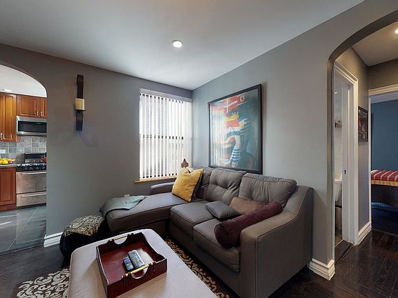 Upon walking into the apartment, you are welcomed with a charming living room drowned in sunlight, beautifully stained hardwood floors, high-hat lighting, and an open archway to the kitchen. The kitchen features beautiful tile work, recently updated cabinets, and is decked out with stainless steel appliances. The bedroom is large, can accommodate a king-sized bed, and is accessed through the corridor where you will also find a large double-sized closet and a recently revamped full bathroom.