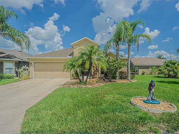 STUNNING REMODELED HOME, with over $40,000 in recent upgrades, is MOVE-IN READY! Welcome to this beautifully updated 2,065 sq. ft. home in the highly desirable 55+ Tampa Bay Golf & Country Club, offering 3 bedrooms, PLUS office/den that can double as a 4th bedroom, 2 baths and Extended lanai. From the moment you arrive, you’ll be impressed by the curb appeal—lush, manicured landscaping, epoxy-coated driveway and walkway, and a screened front entry that invites warm Florida cross breezes. Once inside, you will be impressed with the soaring vaulted ceilings, freshly painted interiors, new lighting, Plant shelves and abundant natural light from large double windows. The Light, Bright and OPEN formal living and dining areas are perfect for entertaining, with chairrail, tall baseboards and new LVP (Luxury Vinyl Plank) flooring flows throughout the main living spaces and office. The heart of the home is the gourmet kitchen, featuring GLEAMING countertops, undermount sink, all-new cabinetry with designer hardware, a center island, breakfast bar, and cozy dinette overlooking the sideyard lawn. The kitchen opens directly to the great room, where built-in custom pantry closet, arches, and niches add custom character. The split-bedroom layout ensures privacy: the spacious primary suite boasts an enormous walk-in closet and a renovated bath with all new cabinets and counter-topped vanities, and a large walk-in shower with seat and grab bars. Secondary bedrooms are tucked away on the opposite side with their own updated bath. The den/office with double doors can easily serve as a 4th bedroom, guest room, or hobby space. The interior laundry room includes upper storage cabinets, and the garage features a painted floor and room for extra storage. Relax, REST EASY or entertain outdoors on the extended screened lanai, complete with a freshly resurfaced acrylic stone-chip floor, vaulted screen roof, and plenty of room for outdoor dining or gatherings. Living in TBGCC means enjoying a true RESORT Lifestyle in a man-guard gated community just off I-75 with easy access to Tampa, Ocala, Orlando, and the Gulf beaches. RESIDENT OWNED Amenities include: 2 swimming pools (one heated) RESORT style with fountains and lap lanes, the other adult only pool (unheated); Fitness center, Poker room & billiards room in Activities center; Award-winning clubhouse with full-service restaurant, pub/grille, and pro shop, Library, card rooms and banquet facilities; Championship golf (memberships available or pay-as-you-play), Pickleball, Tennis, bocce, cornhole, shuffleboard, onsite entertainment and travel excursions available; Dog parks and scenic ponds; Planned activities, dances, dinner shows, day trips, bingo, bunco, card clubs, and more! This home offers everything you’ve been looking for—modern updates, spacious design, and an active community lifestyle! 2 Seater, 2017 CLUB CAR golfcart,with all new batteries, is negotiable. CALL today to schedule your private showing and see why Tampa Bay Golf & Country Club IS the perfect place to BE!
