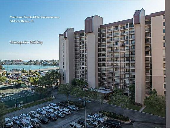 WESTERN WATERFRONT VIEWS FROM THIS 10TH FLOOR COURAGEOUS CONDO in Yacht & Tennis Club on St Pete Beach. 2 Bedrooms, 2 updated baths! STUNNING WATERFRONT VISTAS OF WATERWAY, ISLAND AND INTO THE GULF OF MEXICO. Open kitchen with center island for casual entertaining. Electric storm shutters on western balcony and master suite. Decorated in neutral colors and sold FULLY FURNISHED! Recessed refrigerator for added space in kitchen; built in washer/dryer. Yacht and Tennis Club of St Pete Beach is a gated community with 24 hour security, heated Olympic size pool on waterfront, whirlpool spa, all new fitness center, men's and women's saunas, 7 Har Tru tennis courts, marina with boat slips available for sale or lease. Carefree resort style living! Stroll to beach, restaurants and shops. Boater's paradise with no fixed bridges to Gulf of Mexico.