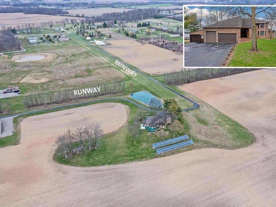 BRING HORSES, CARS, OR PLANES! VERY OPEN & SPACIOUS CUSTOM BUILT ALL BRICK TWO-STORY ON A PRIVATE ~36 ACRE ESTATE W/A RARE 1,700 FT EAST/WEST & 2400 FT NORTH/SOUTH GRASS SHARED RUNWAY, ~1/4 ACRE STOCKED POND W/DOCK &12 X 20 COVERED SHELTER W/STONE GRILL. ~4,000SF ON 3 LEVELS. TWO-STY GREAT RM W/WALLS OF WINDOWS. PRIMARY STE HAS WIC & WALKS OUT TO A PRIVATE DECK. 1ST FLOOR OFFICE/4TH BR. FULL, FNSD WALK-UP LL HAS BR, KITCHEN, SAUNA, FULL BATH & REC RM (PERFECT GUEST/TEEN/IN-LAW STE). 2 OUTBUILDINGS: 35X78 HANGER BARN W/ROOM FOR 14 STALLS, HAYLOFT & 40 FT PLANE DOOR. FENCED PASTURE. THE HANGER HAS A 45 FT PLANE DOOR & COULD FIT 6-8 CESSNAS. SOLAR PANELS AND MANY RECENT UPDATES. 4 CAR ATTACHED GARAGE & SO MUCH MORE!
