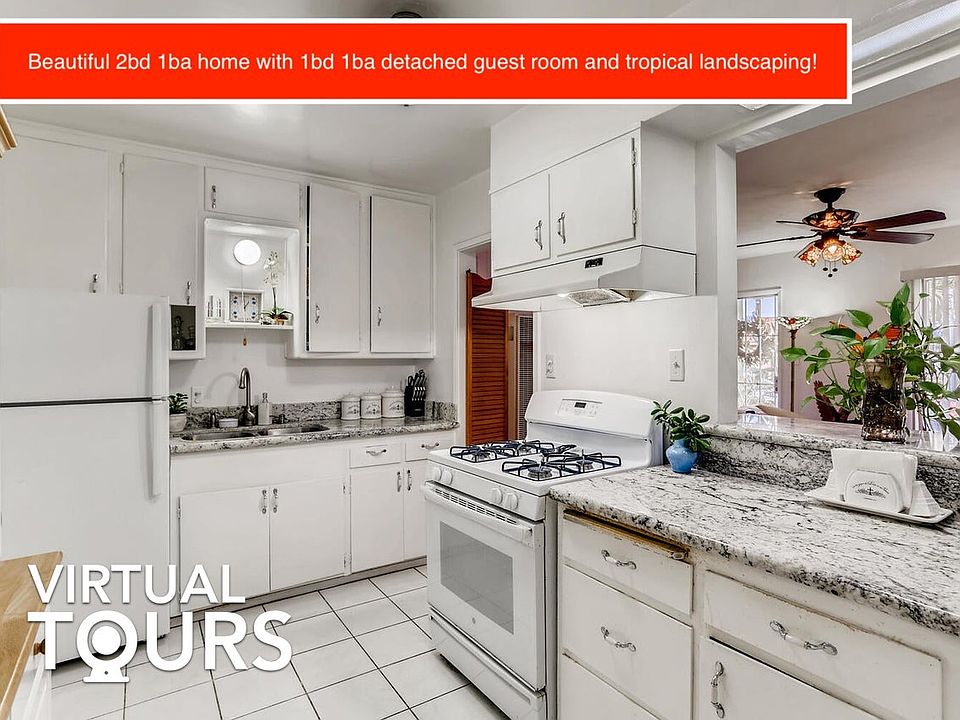 This beautiful and lush Bellflower property contains a 2 bd / 1 ba main house, 1 bd / 1 ba detached guest room, and lovely outdoor living spaces! The front of the home has a fenced-in lawn, patio, and tropical landscaping - the perfect spot to enjoy a morning cup of coffee! Upon entrance, notice the wood floors, crisp white walls, and natural light. The living room sits to the left with a picture window overlooking the front yard. Up ahead is the kitchen, equipped with granite countertops, white cabinets, a gas cooktop, bar seating, and tile flooring! Pass the dining room, with a stained glass light fixture, on your way into the tiled den - a great place to entertain! The two bedrooms have mirrored closet doors and access to the hallway bath, featuring a wood vanity, mirrored medicine cabinet, glass door shower/tub, and tile wall surround. Rent out the guest house for additional income; it has cozy wood wall panels and a white vanity. Outside, relax on the large, partially covered patio, alongside the fruit trees and flowers! Forced Air heating. Two car detached garage and enclosed carport. Sprinkler and alarm systems. Storage shed. Fresh interior/exterior paint. Located near Kaiser, parks, shopping, and restaurants! Easy access to I-5/105/605 and DTLA. Buyer should verify all information.