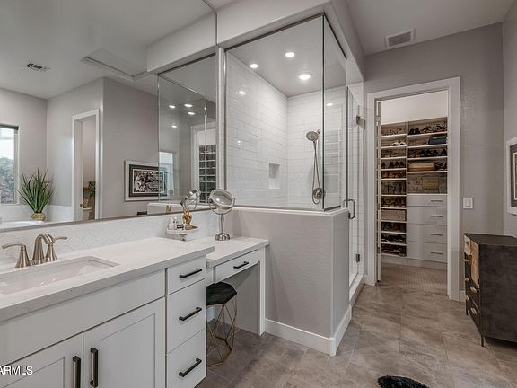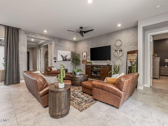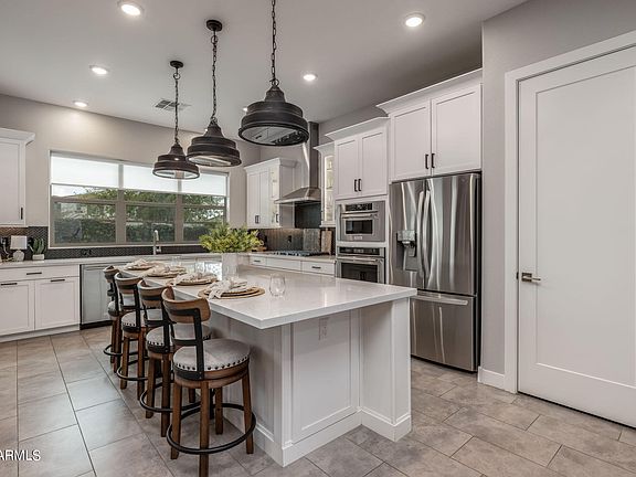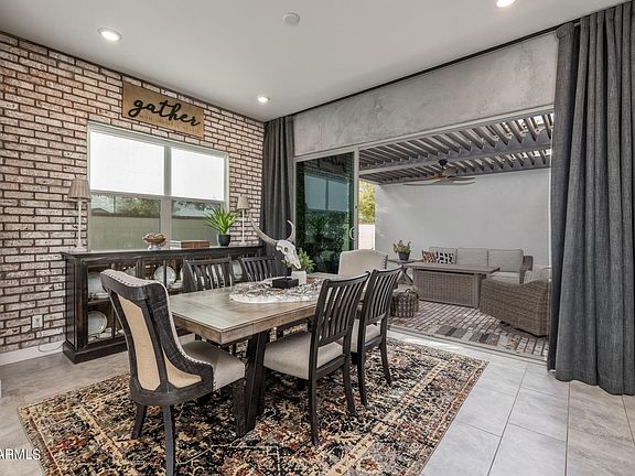 Welcome to this stunning home boasting impressive curb appeal, featuring a freshly painted exterior, an iron security door, an extended driveway, a new garage door, and lush turf, all situated on a coveted corner lot. Notably, it is directly across from one park and adjacent to another, offering convenience and extra privacy with no neighbors behind or next to you! Step inside to discover a gourmet kitchen that will delight any chef, complete with white shaker cabinets, quartz countertops, top-of-the-line KitchenAid appliances, a striking black slate herringbone backsplash, soft-close drawers, and upgraded pendant lights, combining style and functionality seamlessly. (CLICK TO READ MORE) Accent walls throughout the home, such as the brick accent wall in the dining room, add character and charm, complementing the brick pavers in the courtyard, which also boasts a motorized pergola, perfect for outdoor entertaining and relaxation. The primary suite is a luxurious retreat, boasting ample natural light, a separate tub and shower tiled all the way to the ceiling, a quartz countertop, and a custom walk-in closet, ensuring comfort and style. Additional features include upgraded single panel doors throughout, a new tankless water heater, a new AC unit, epoxy flooring and cabinets, and overhead storage in the garage, offering convenience and efficiency. Outside, the backyard is a true oasis, featuring a newly built-in outdoor kitchen equipped with a grill, a pergola, landscape lighting, misters, and travertine, providing the perfect setting for outdoor gatherings and enjoyment. Nestled within a gated section of Eastmark, this home offers access to resort-style amenities, including a luxurious community pool, splash pads, numerous parks spread throughout, the Steadfast farm, the Handlebar Diner, and its very own state-of-the-art clubhouse "The Mark". The Mark hosts events throughout the year and a wide variety of family-friendly games to play. Don't miss the opportunity to make this incredible home yours and experience luxury living at its finest!