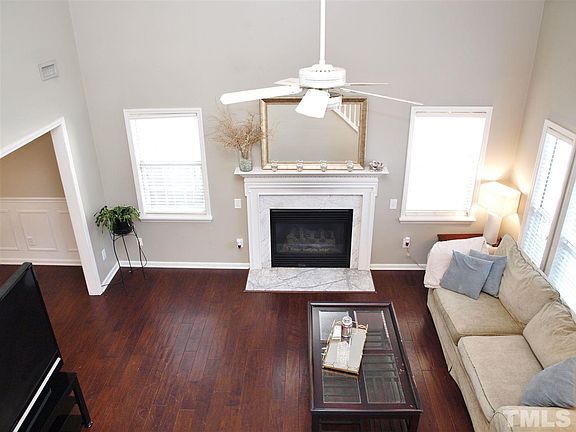 Lovely 1.5 story home with desirable first floor master suite. Light and bright floor plan. Living room has cathedral ceiling and cozy gas log fireplace. Ample cabinet and counter space in kitchen with pass through window to formal dining area. The loft has built in cabinetry and is perfect for working at home. There is a huge walk in attic for your storage needs. Enjoy the fenced backyard from the covered patio. Storage shed for your outdoor equipment. Great location with easy access to RDU, I-540, RTP.