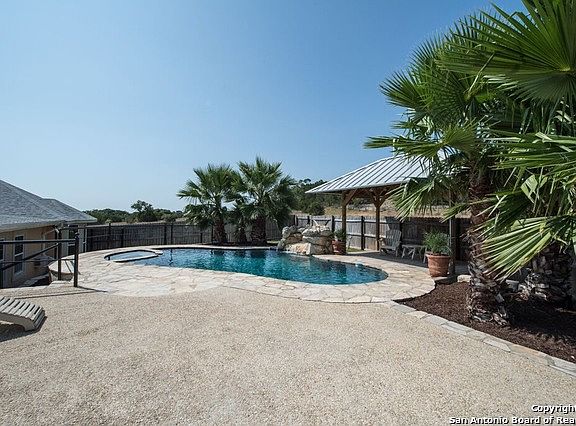 Beautiful country living in desirable Mystic Shores! Gorgeous pool with fountain and Hot tub, surrounded by stonework as well as gazebo & huge palm trees for your relaxing days enjoying your oasis in the Texas Hill Country ! 3200 sq. ft. barn/shop with electricity. Additional huge living area that leads to fantastic covered patio for outside entertainment. Extended VERY NICE carport coming off of garage. Gated entry. Truly a gem! Sq. ft. to be verified.