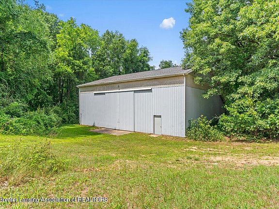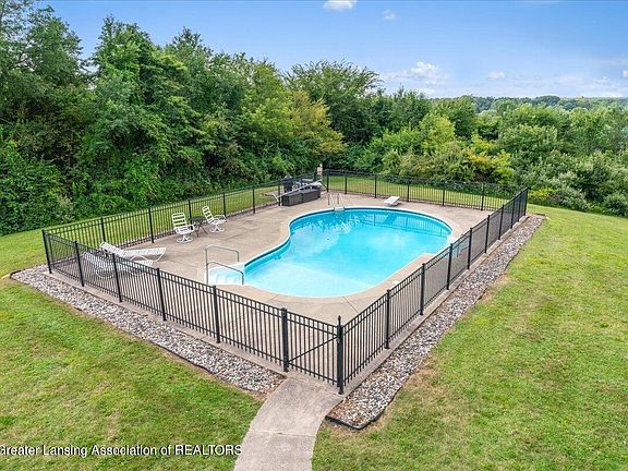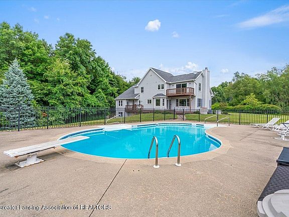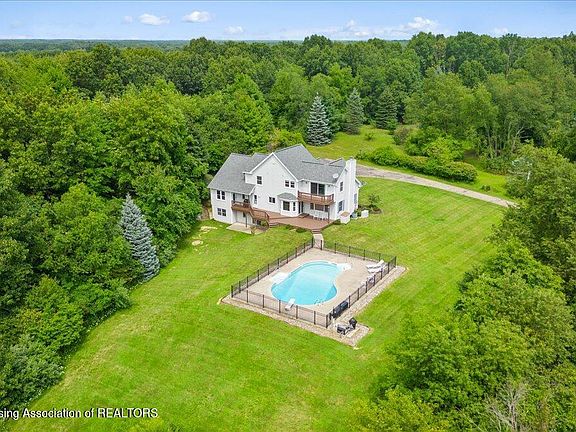 WOW! Rare Find on over 21 Acres + Pole Barn + Inground Pool and an absolutely stunning home in the award winning Haslett School District! Located at what is said to be the highest point in Ingham County, this home has the most amazing views on such a peaceful country setting-- watch City of Lansing fireworks in the distance from your back deck! This dream property consists of over 21 acres of a mix of woods, trails, and the perfect amount of open space for your home and custom inground pool. The large detached pole barn has so much storage and your very own indoor basketball court! This 4-5 bedroom custom built home has a fabulous open floor plan with a spacious living room with cozy fireplace and beautiful views of the land and pool. Connected to the living room is the eat-in dining area and open kitchen with quartz countertops, island, lots of cabinet space, and stainless appliances. Formal dining room or den is conveniently located just off the kitchen as well as the first floor laundry room. There is also a main floor office that was also custom built to also function as a first floor bedroom with access to its own full bathroom with an accessible entrance, perfect for in-law quarters as well. This space also has its own access out to the beautiful deck with views for miles! Upstairs features the primary bedroom suite with so much space, brand new carpet and attached ensuite bathroom, which has been beautifully updated with double sinks, quartz countertops, walk-in shower with glass euro door and tiled floors. Two additional bedrooms are upstairs as well as another full bath. The walkout lower level has an additional family room space as well as a possible future 5th bedroom and is also plumbed for a fourth bathroom. Updates include new roof (3 years), updated primary bathroom and 2nd floor bath (2017) with new shower, cabinets, vanity, seat, mirrors, new bathroom windows, flooring and lighting. Updated kitchen (2022) new quartz countertops, sink, grates, faucet, new range, refrigerator, new garage door opener/system, Generac whole house generator, new front porch column (2022), new sump pump (2023), newer A/C, mechanicals serviced every year, and so much more! This home has been meticulously maintained and to get such a beautiful home PLUS the acreage, pool and pole barn is such a rare find! Call for your personal tour today!