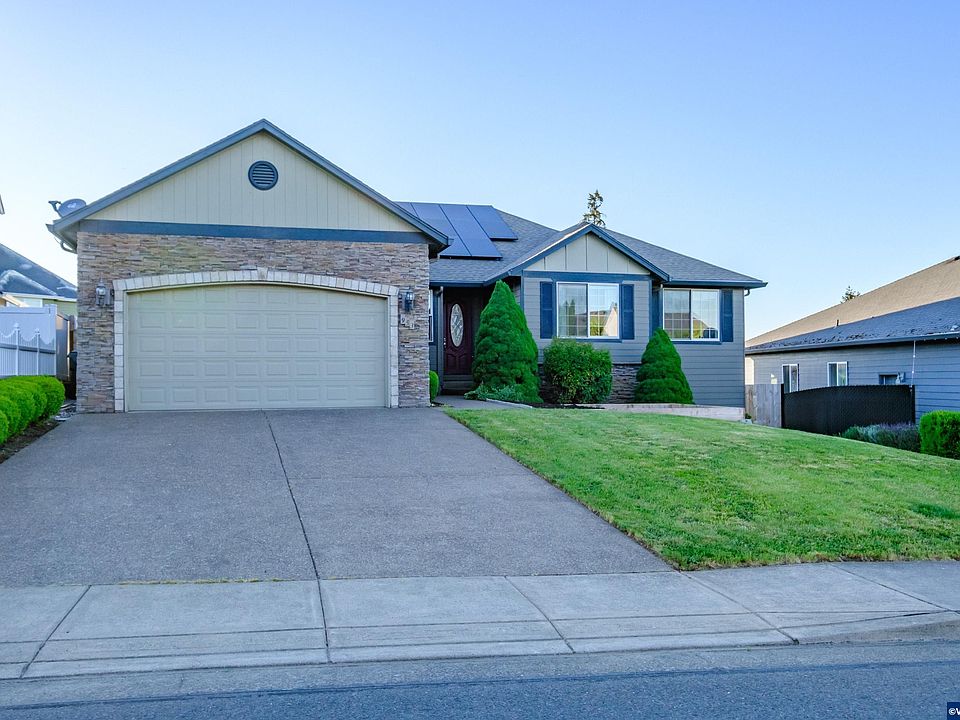 Beautiful hard to find single level 4 bedroom home in Deer Ridge Estates! Open concept floor plan with gourmet kitchen, walk in pantry, granite, and SS appliances! Formal & informal dining, stone gas fireplace, vaulted ceilings, AC & paid for solar panels! Spacious primary suite with spectacular closet & beautiful views. Deck w/ view to the east & west.