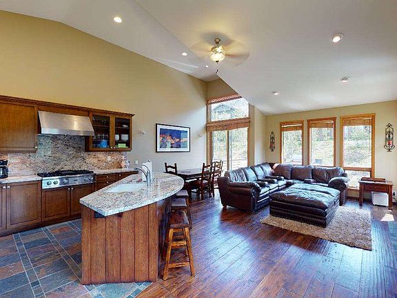 Beautifully remodeled Ridgeview floorplan with views of Mammoth rock and beyond. Slate floors in the entry, hallway bathrooms and kitchen with heated floors in the master bathroom and kitchen. Wood floors in the living and dining room and stairs. Granite counters and backsplash in the kitchen with beautiful cabinetry, wine refrigerator and a stainless steel Viking stove. Built-in cabinetry for TV, speakers and media storage surround a beautiful "Heat N Glo" gas fireplace. Remodeled master bathroom features two sinks, heated floors, new cabinetry and a large walk-in shower. Sold furnished.