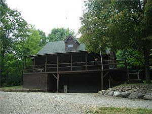 LARGE LOG HOME SITS 300' BACK FROM THE ROAD - 5-6 ACRES - HEAVILY WOODED - 2 CAR ATTACHED & 3 CAR LOG DETACHED GARAGE WITH A FULL 24 X 32 SECOND FLOOR - CATHEDRAL CEILINGS IN LIVING ROOM & DINING ROOM AREA - LARGE LOFT - 2.5 BATHS - SLIDING GLASS DOOR LEADS TO A WRAP DECK - WOOD STOVE 2007 MAKES FOR A COZY HOME - 2 FINISHED ROOMS IN BASEMENT WITH 1/2 BATH -