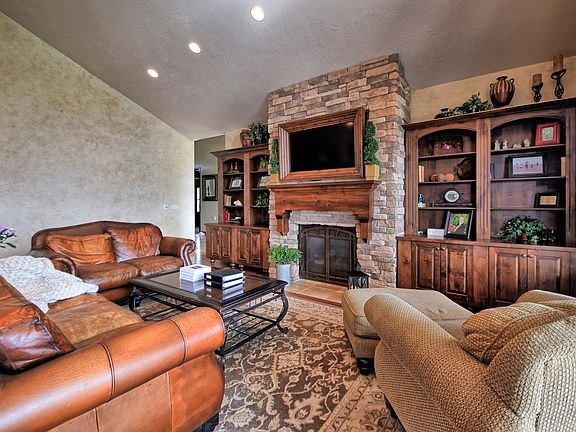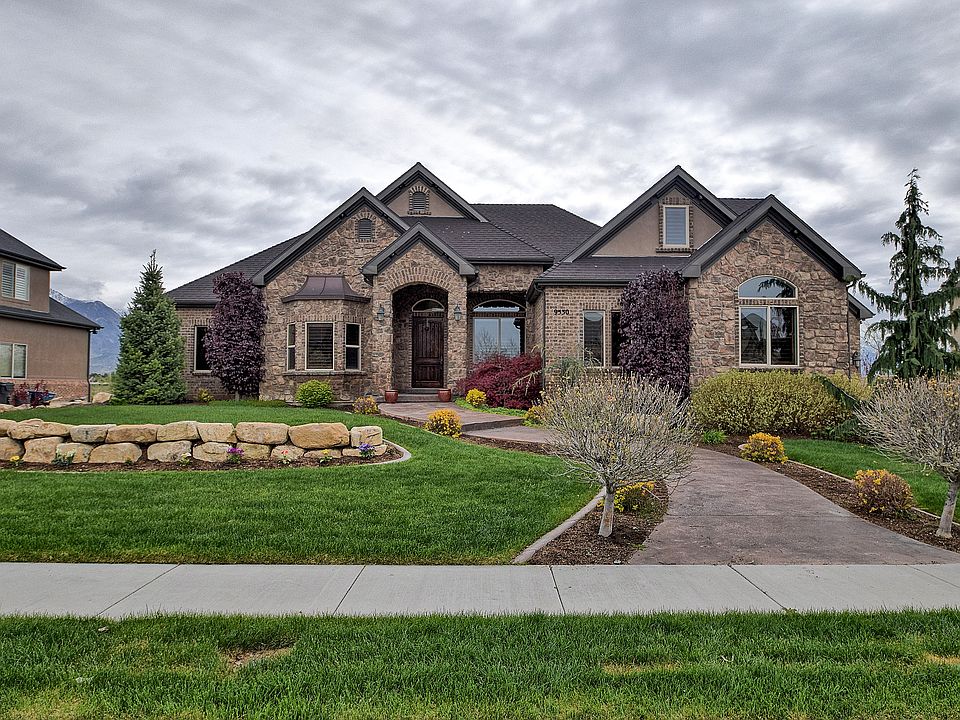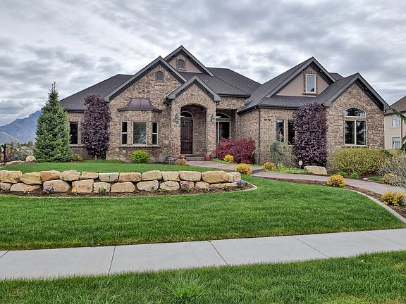 Unobstructed & breathtaking views of east bench mnts that will never be blocked.Professionally landscaped w/1 lrg covered patio,1 open patio,1 walk out basement patio beautifully hardscaped with pavers, brick&stone,sport court,simulated rock fence.Open fl plan designed to entertain w/ custom built-ins up&down.Huge kitchen,Sub Zero fridge w/ solid wood floors.Shutters throughout home.2 kitchens,2 FR's,1LR,1den,massive 3rd car garage.No projects! Home&yard in excellent shape.Must see to appreciate