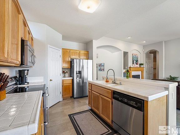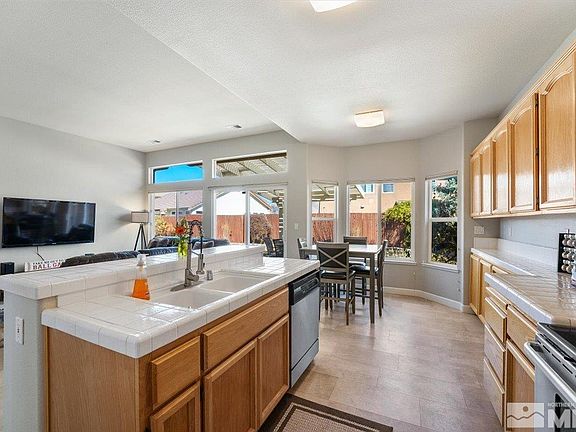 Welcome to your light-filled haven in Damonte Ranch! This move-in ready, single-level home boasts 3 beds, 2 baths, and an oversized 2-car garage. The open floor plan with tall ceilings is light and bright with lots of windows (and plantation shutters) offering an abundance of natural light throughout. The kitchen features stainless steel appliances, tile countertops, oak cabinets, an island with extra storage, a spacious pantry, a... (see extended remarks), ...breakfast bar, and a sunny nook with a large bay window. The primary suite is an oasis with a three-sided fireplace; an adjoining flex room (perfect for an office, nursery, den, or sitting room); and a large bathroom offering a garden tub, separate shower & walk-in closet. Enjoy the outdoors with a large covered patio in the front and a loggia-slatted canopy covering the back patio. Additional highlights are a second gas fireplace in the inviting family room with a custom oak mantle; upgraded water-proof tile in most rooms; and the included washer, dryer, and kitchen refrigerator. The water-supply plumbing has been relocated out from under the slab foundation already. This is an "As-Is" sale. Don't miss out…this gem won’t last!